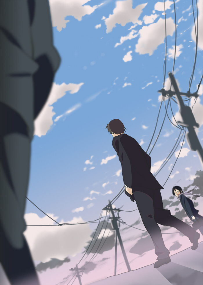 matsuo yukihiro, aoi sena, nishijou takumi, orihara kozue, 5pb., chaos;head, science adventure, game cg, 00s, 1boy, 2girls, antenna hair, blonde hair, blue eyes, blue hair, bow, flower, grey eyes, long hair, multiple girls, necktie, nervous, short hair, sword, twintails, weapon, yellow eyes
