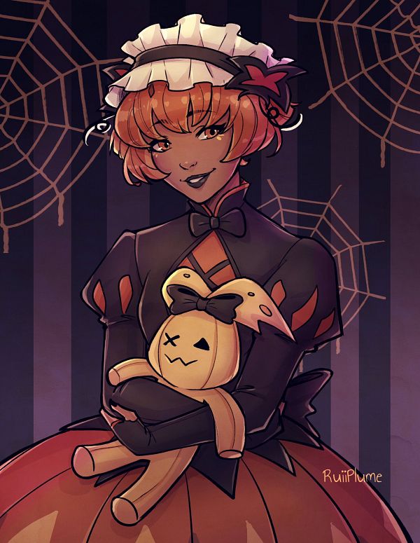 1girldresshair ornamenthairbandholdingholding stuffed toyhumanizationjuliet sleeveslolita hairbandlong sleeveslooking at viewerorange eyesorange hairpuffy dresspuffy sleevesshort hairsmilesolostuffed animalstuffed toy