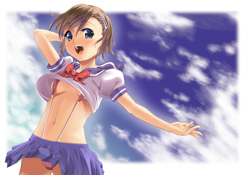 fujii maki, himemiya chikane, kurusugawa himeko, kannazuki no miko, light brown hair, lowres, 00s, 2girls, bare legs, barefoot, bikini, blue eyes, blue hair, bow, breasts, clenched hand, feet, female focus, full body, hair between eyes, hair ribbon, hairband, knee up, legs, long hair, looking at viewer, midriff, multiple girls, navel, one-piece swimsuit, purple eyes, ribbon, smile, swimsuit, turtleneck, turtleneck one-piece swimsuit, upside-down, very long hair
