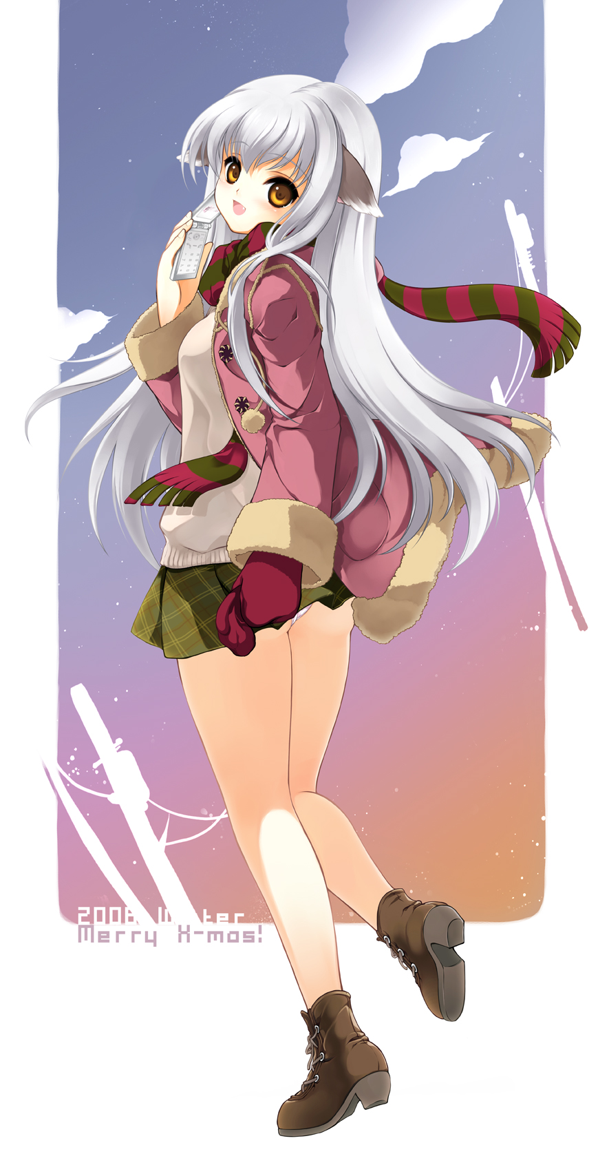1girlanimal earsassbootsbrown bootsbrown eyescellphonechristmascoatfangfemale focusfull bodygloveslace-up bootslegslong hairlooking at viewerminiskirtpantiesphoneplaid clothesplaid skirtscarfskirtsolostriped clothesstriped scarfunderwearupskirtwhite hairwinter clothes