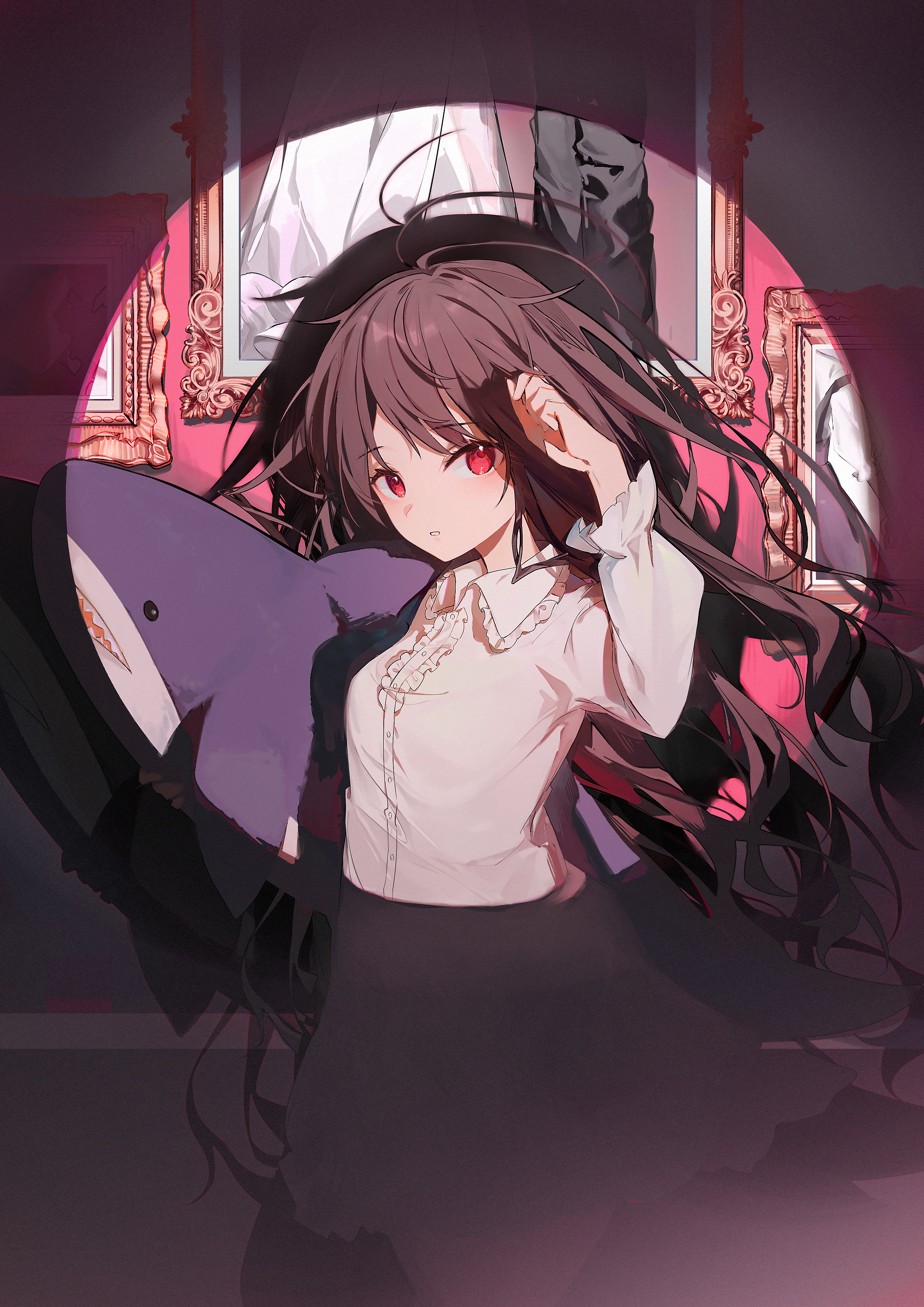 1girlbrown hairdresslong hairlooking at viewerlooking to the sidepainting (object)red eyessharksolostuffed animalstuffed sharkstuffed toywhite dress