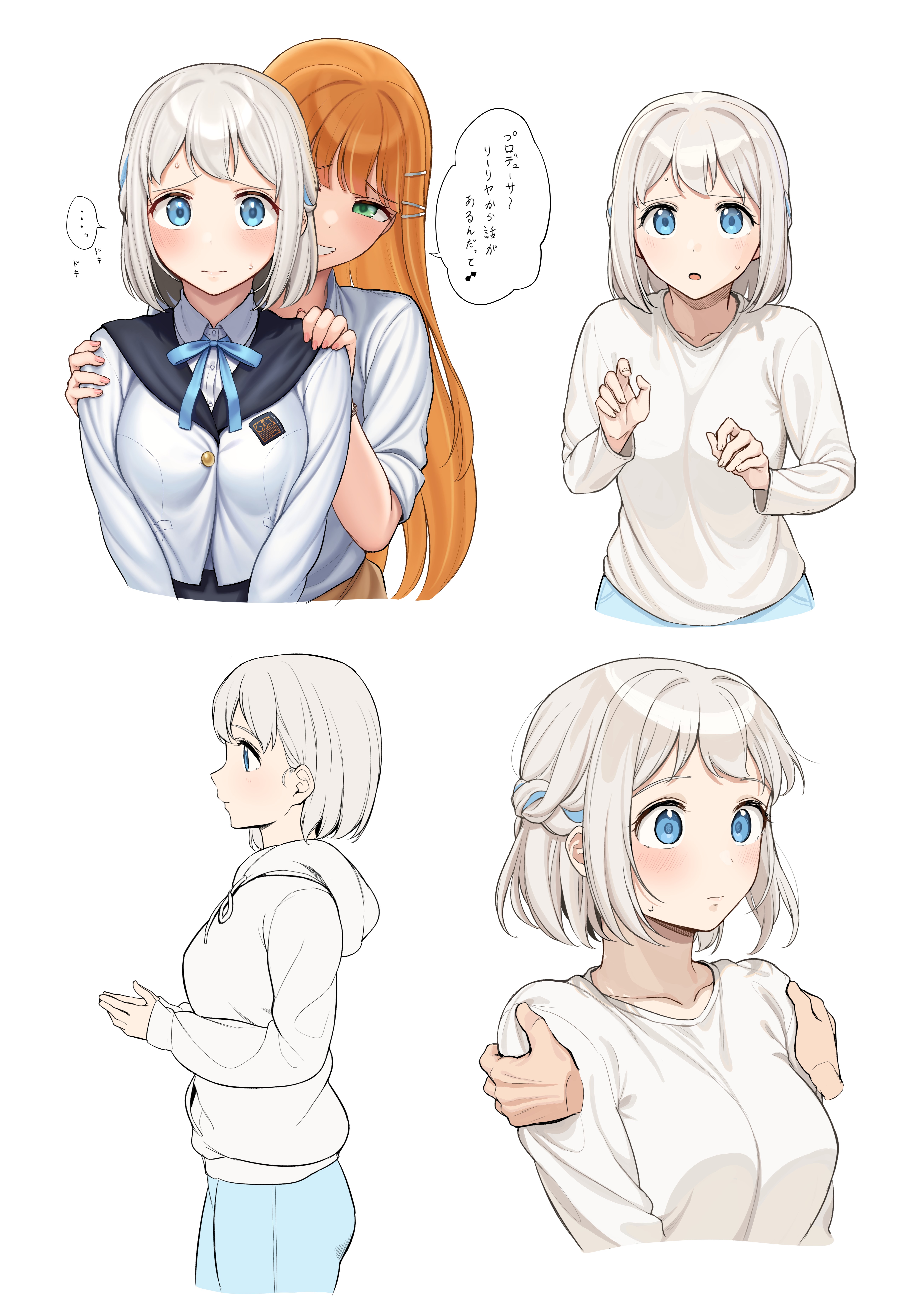 azusa (blue archive), eri (blue archive), mika (blue archive), blue archive, 3girls, angel wings, annoyed, bat (animal), blush stickers, bow, bowtie, braid, card, dress, flower, gun, hair flower, hair ornament, halo, hat, holding, holding card, jacket, long coat, long hair, multiple girls, orange eyes, pink hair, purple eyes, ribbon, rifle, school uniform, shirt, side bun, skirt, sweater, weapon, white hair, wings, witch hat, yellow eyes