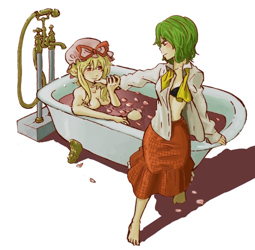 2girlsascotbarefootbathbath of bloodbathingbathtubblonde hairbloodbreastsclaw foot bathtubfemale focusgreen hairhatkisskissing handmedium breastsmultiple girlsopen clothesopen shirtpetalsplaid clothesplaid skirtred eyesribbonsame-sex bathingshared bathingshirtshort hairskirtyuri