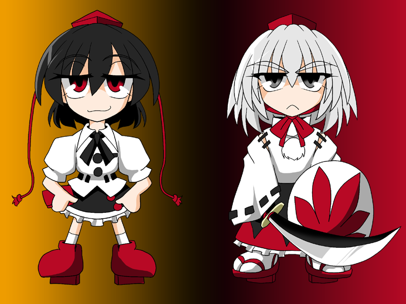 2girlsblousecollared shirtfemale focusgetagradient backgroundhair between eyeshatmultiple girlssandalsshirttengu-getawhite shirtzouri