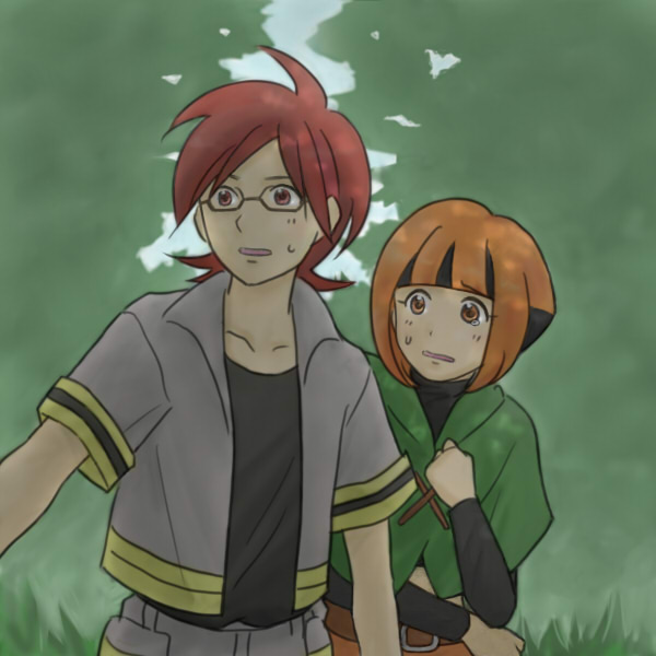 simon stalenhag, highres, 1boy, 1girl, black hair, black jacket, boots, cable, cloud, cloudy sky, day, denim, field, flower, grass, jacket, jeans, pants, science fiction, sky, stairs, standing, things from the flood
