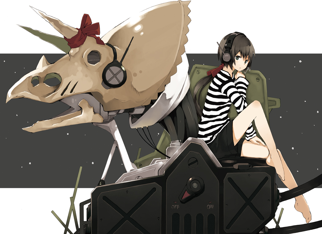 antennaebarefootblack hairbrown hairdinosaurfeetheadphoneslong hairmachineponytailsittingskeletonskullsolo