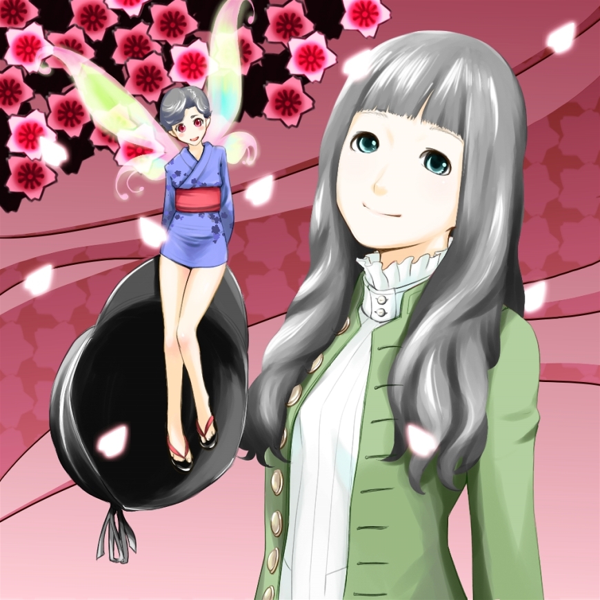 demon (megami tensei)fairygreen eyesgrey hairhatjapanese clotheskimonolegslong hairmini personminigirlsandalssmilewings