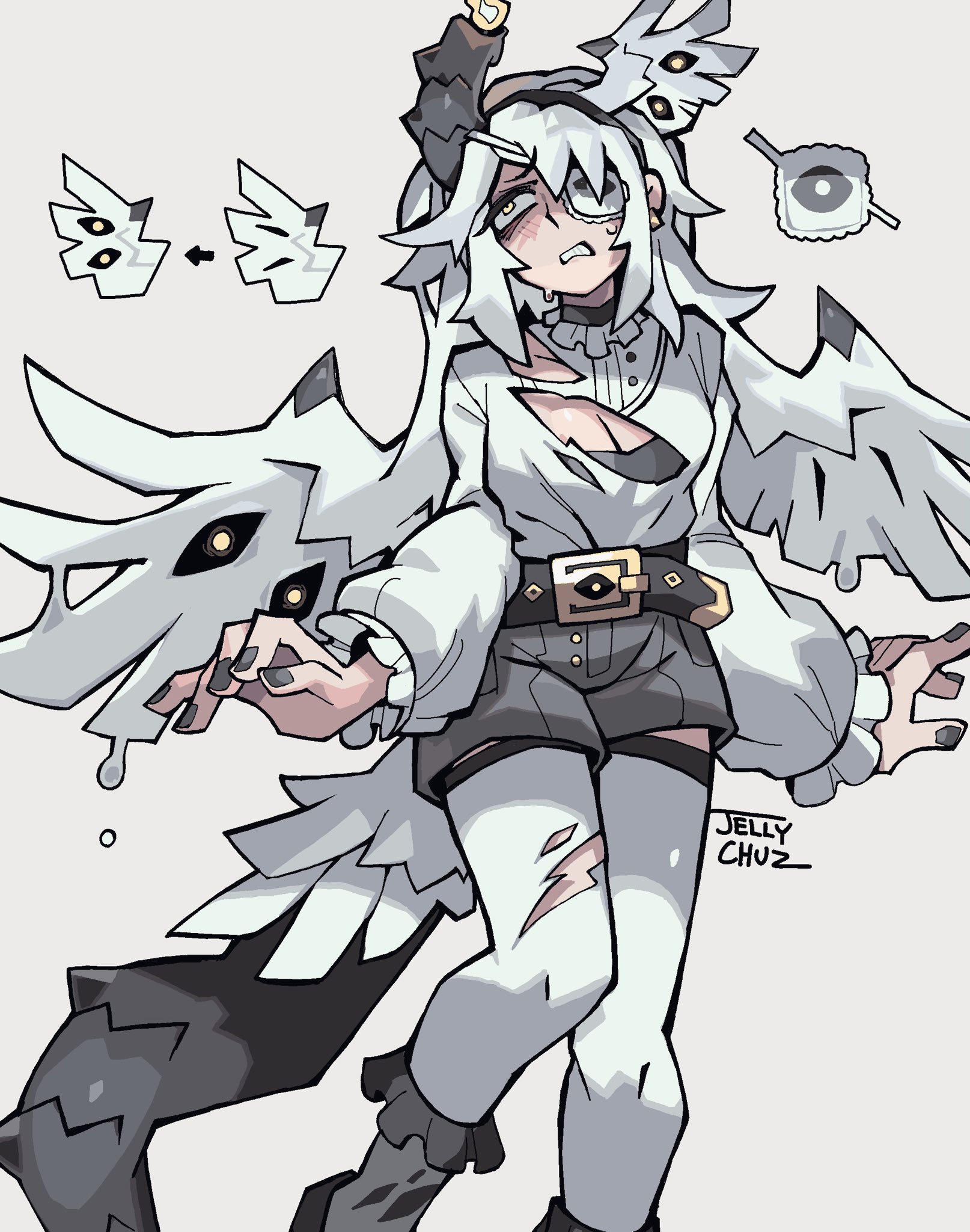 1girlbeltblack shortseyepatcheyes on wingsfeathered wingsfrilled sleevesfrillsgrey backgroundhair wingshead wingshornslong hairlong sleevesmultiple wingspuffy long sleevespuffy sleevesshirtshortssimple backgroundsweattailthighhighstorn clothestorn shirttorn thighhighswhite hairwhite shirtwhite wingswingsyellow eyes
