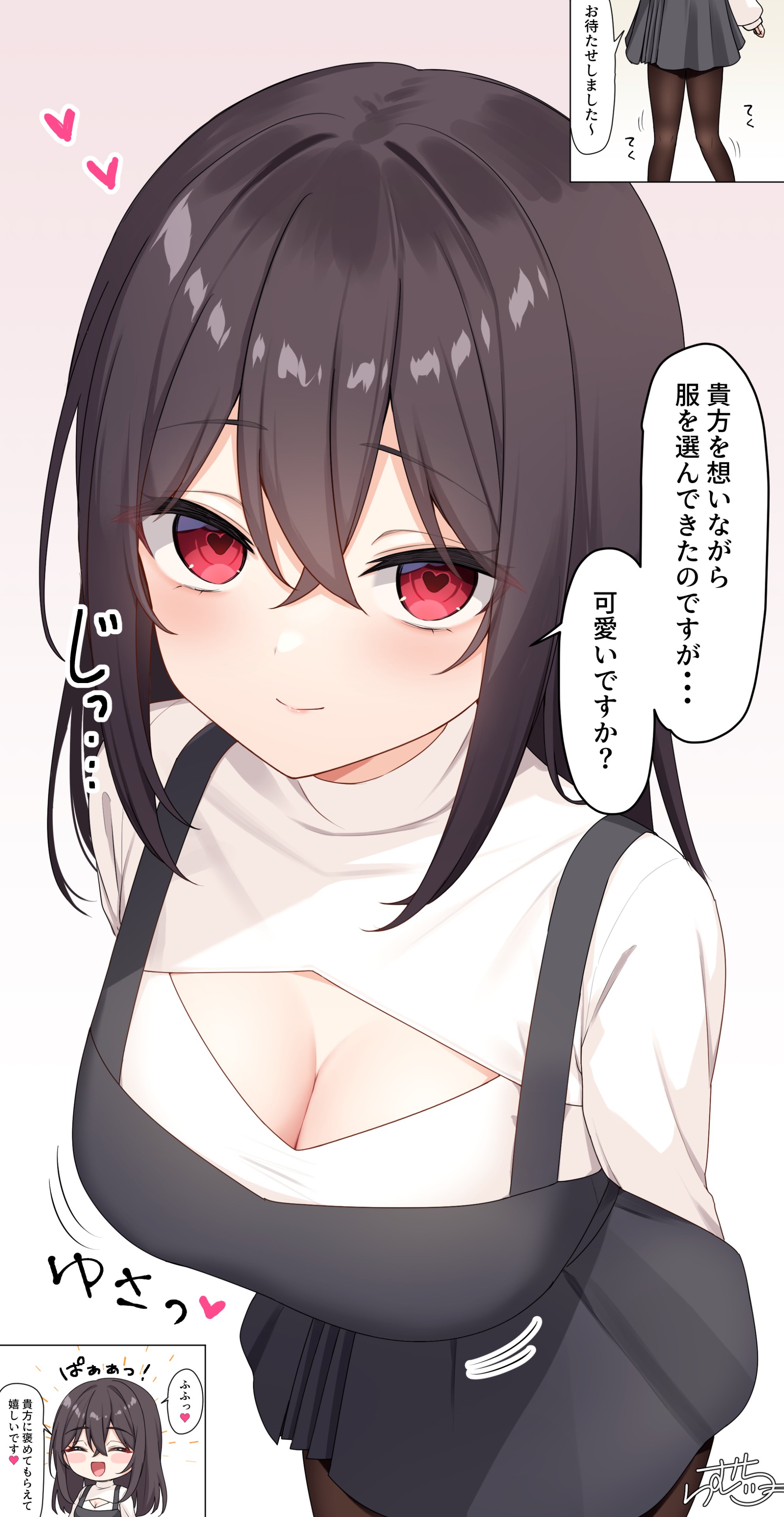 1girlblack hairbreastschibichibi insetcleavagecleavage cutoutclothing cutoutfrom abovelight blushlight smilelong hairlooking at viewerred eyes