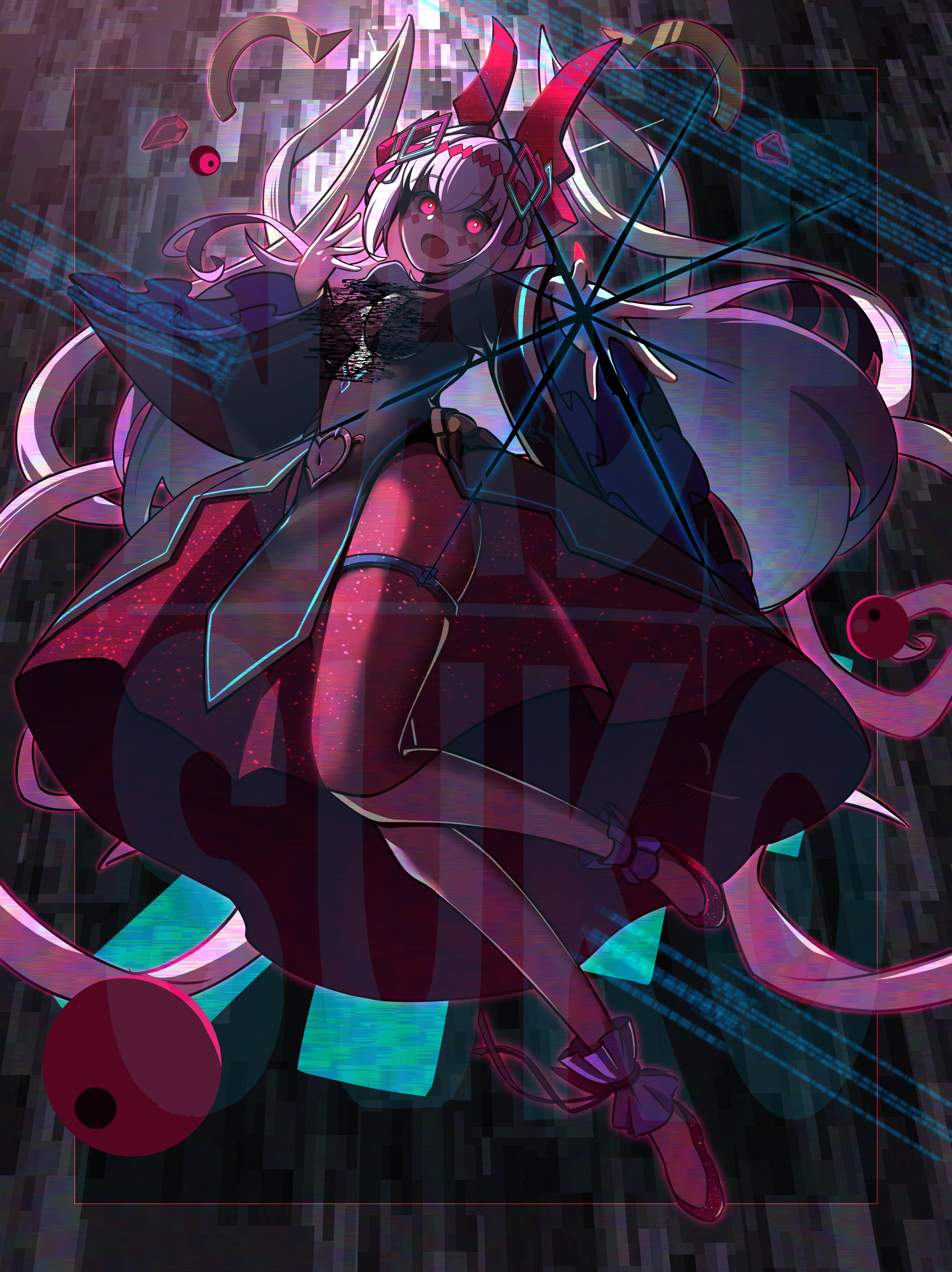 nanoless, silvervale, indie virtual youtuber, commentary, english commentary, highres, 1girl, animal ear fluff, animal ears, artist name, blue hair, blush, breasts, bridal gauntlets, cleavage, closed mouth, finger heart, fingernails, hand up, heart, large breasts, leaning forward, looking up, multicolored hair, one eye closed, pink eyes, pink hair, pink skirt, skirt, solo, virtual youtuber, white bridal gauntlets, wolf ears, wolf girl