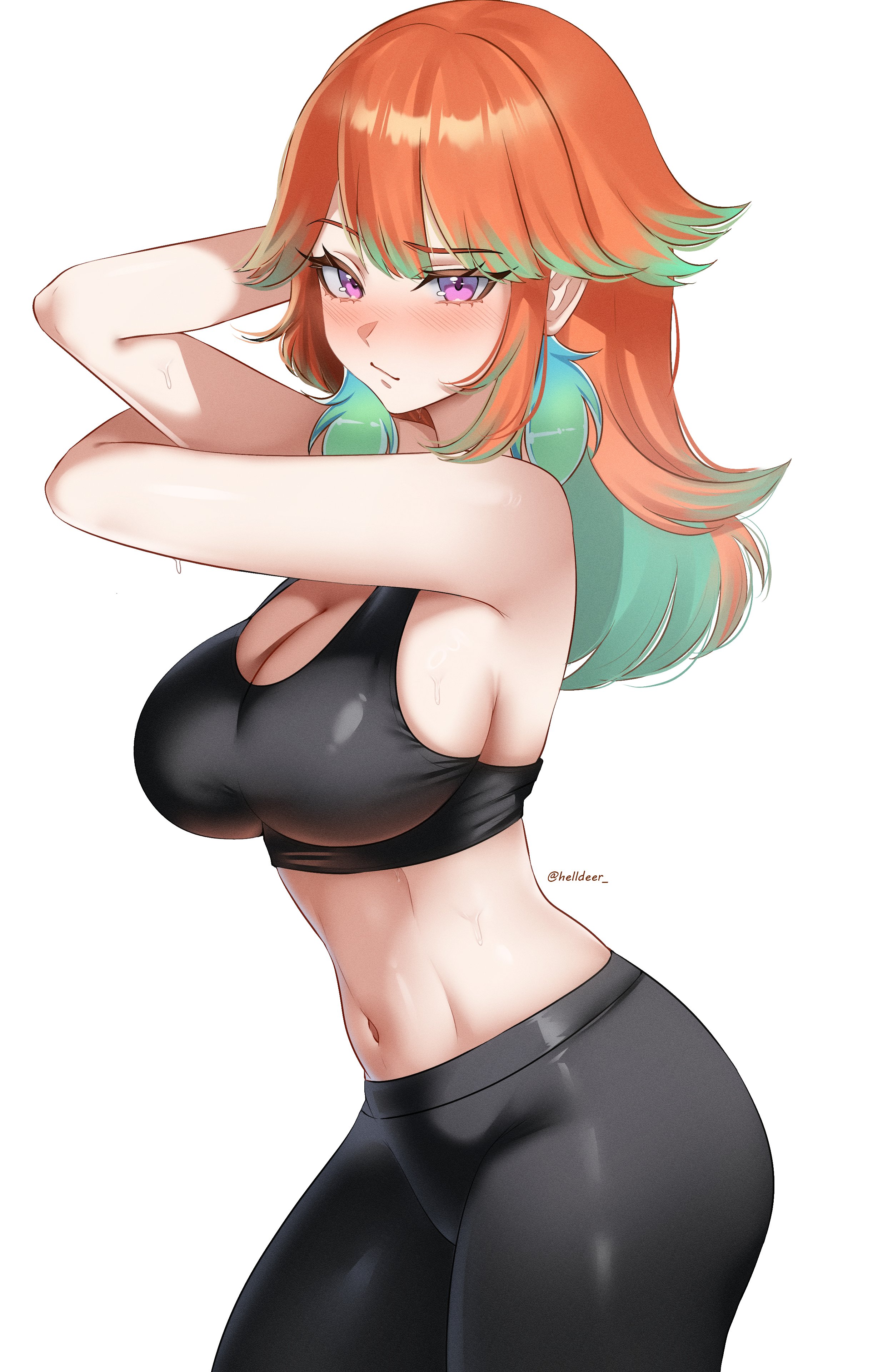 1boy1girlalternate costumeblack pantsblack sports brablunt bangsblushbreastscleavageclosed mouthcolored inner haircolored tipscowboy shotearringsfeather earringsfeathersgreen hairjewelrylarge breastslong hairlooking at viewermidriffmulticolored hairnavelorange hairpantspink eyessideboobsimple backgroundsolosports brasportswearsweattight clothestwitter usernametwo-tone hairvirtual youtuberwhite backgroundyoga pants