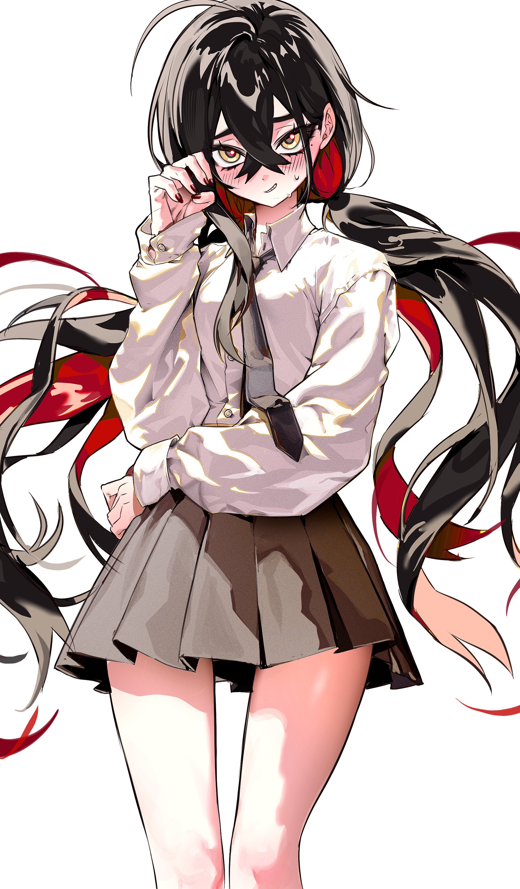 1girlalternate costumealternate hairstyleblack hairblack necktieblushcollared shirtcolored inner haircrossed bangshair between eyeslong hairlong sleeveslooking at viewermolemole under eyemulticolored hairnecktiepleated skirtred hairred nailsshirtskirtsolotwintailstwo-tone hairvery long hairwhite shirtyellow eyes