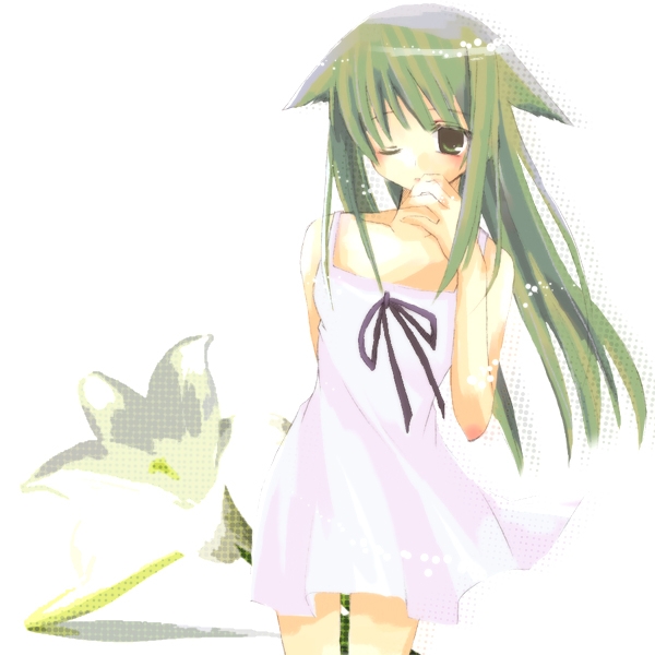 amaterasu (ookami), capcom, ookami (game), 1girl, animal ears, barefoot, female focus, full body, green eyes, hakama, hakama skirt, japanese clothes, kimono, long hair, magatama, miko, personification, red hakama, simple background, skirt, solo, tattoo, toeless legwear, toes, white hair, wolf, wolf ears