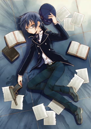 1girlandrogynousbookfemale focusglassesgunhatlyingnewsboy capreverse trapsolounworn hatunworn headwearweapon