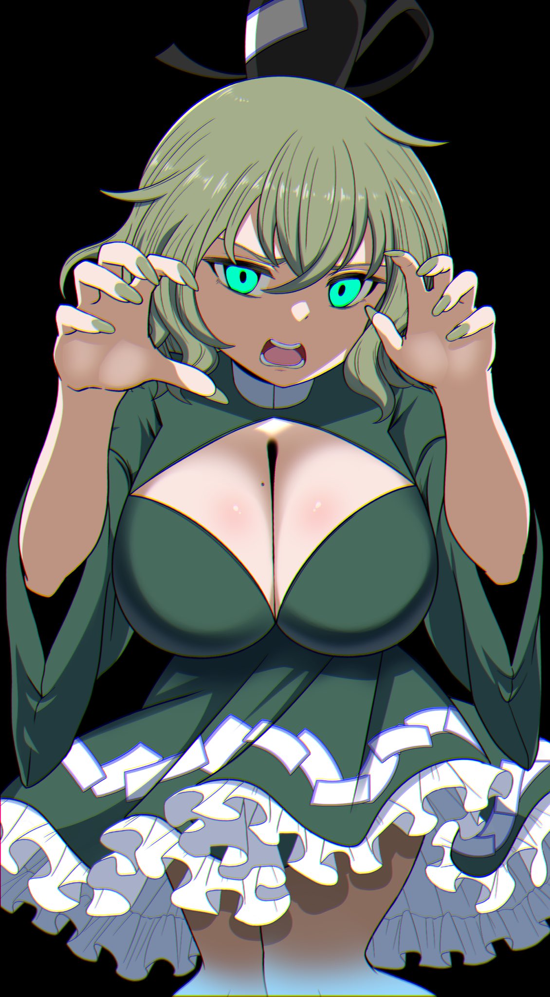 1girlblack backgroundbreastsclaw posecleavagedressghostgreen dressgreen eyesgrey hairlarge breastslooking at vieweropen mouthsimple backgroundsolo