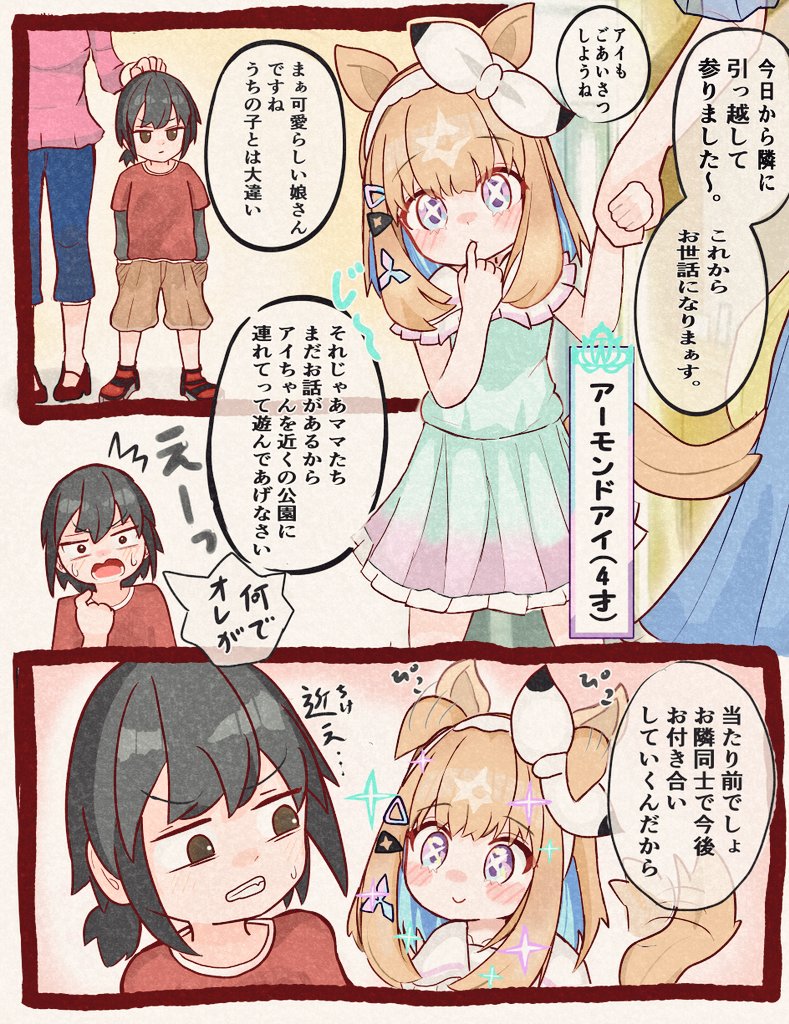 1boyanimal earsblue eyesblue hairbrown hairhair ribbonhorse earshorse girlhorse tailribbonstar (symbol)symbol-shaped pupilstailwhite ribbon