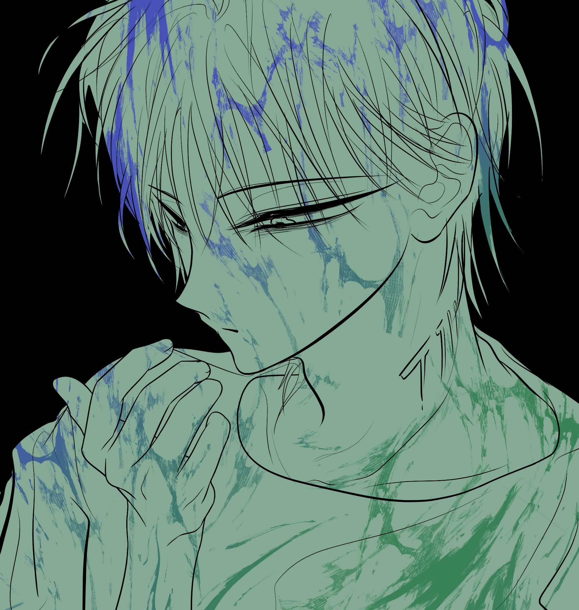 1boyblack backgroundgreen themehaembokk 0312limited palettelooking at handmale focusneck tattooshort hairsolotattoo