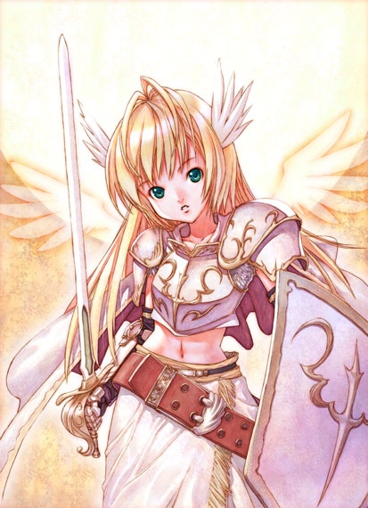 1girlangelarmorbeltbelt skirtbelted skirtblonde haircapefemale focusgreen eyeshead wingsmidriffnavelshieldskirtsoloswordweaponwings