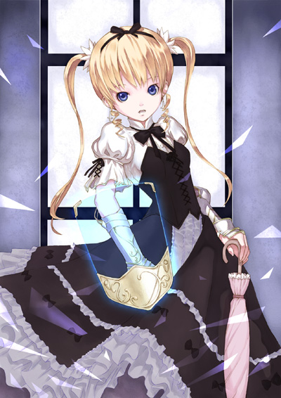 1girlblonde hairblue eyesbowdressfemale focusfrillsgauntletsgothic lolitahair bowhair ribbonhairbandindoorslolita fashionribbonshieldsolotwintailsumbrellavictorian