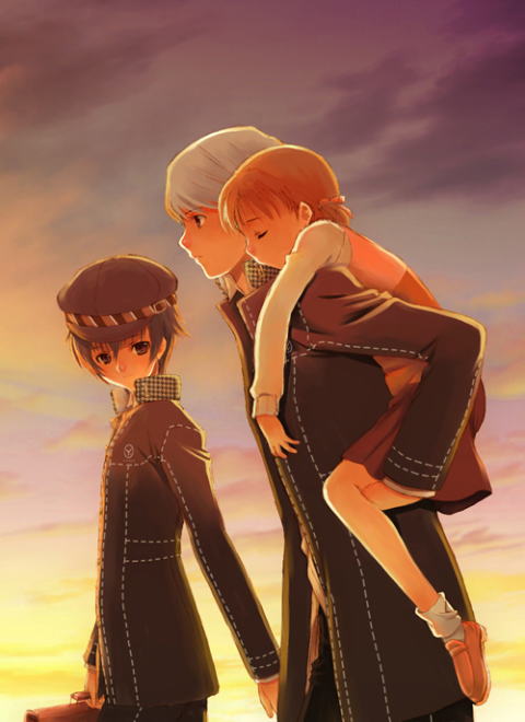 himagosan, anosillus ii, anti (ssss.gridman), shinjou akane (new order), gridman universe, gridman universe (movie), highres, 1boy, 2girls, black hair, blue eyes, braid, breasts, cleavage, closed eyes, closed mouth, earrings, epaulettes, formal clothes, frilled skirt, frills, glasses, gloves, grey hair, hair over one eye, hug, hug from behind, jacket, jewelry, long hair, long sleeves, multiple girls, necktie, open mouth, purple hair, shirt, short hair, simple background, skirt, smile, suit, upper body, white background, white gloves, white shirt