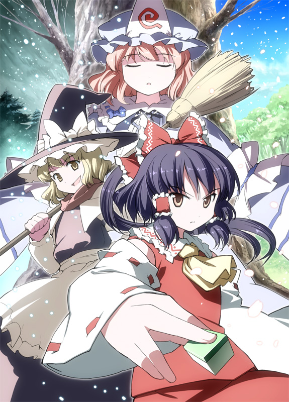 3girlsblonde hairboard gamebowbraidbrown eyesbrown hairdetached sleevesfemale focushair bowhair tubeshatholdingholding mahjong tilejapanese clotheslong hairmahjongmahjong tilemultiple girlsopen mouthpink hairribbonshort hairtreetriangular headpiecewitch hatyellow eyes