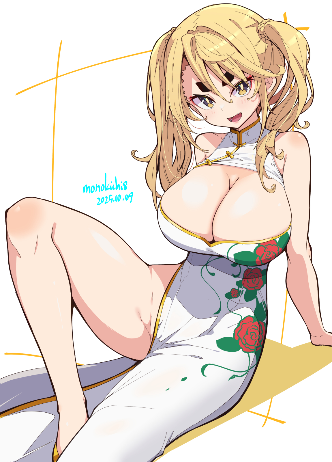 kuzuhara kazuya, original, absurdres, highres, 1girl, black bow, blush, bow, closed mouth, dot mouth, dress, english text, flower, food, fruit, grey background, hair bow, hair flower, hair ornament, holding, holding food, holding fruit, lemon, lemon slice, long hair, looking at viewer, multicolored hair, off-shoulder dress, off shoulder, orange (fruit), ponytail, short sleeves, solo, white dress, white flower, white hair, yellow eyes