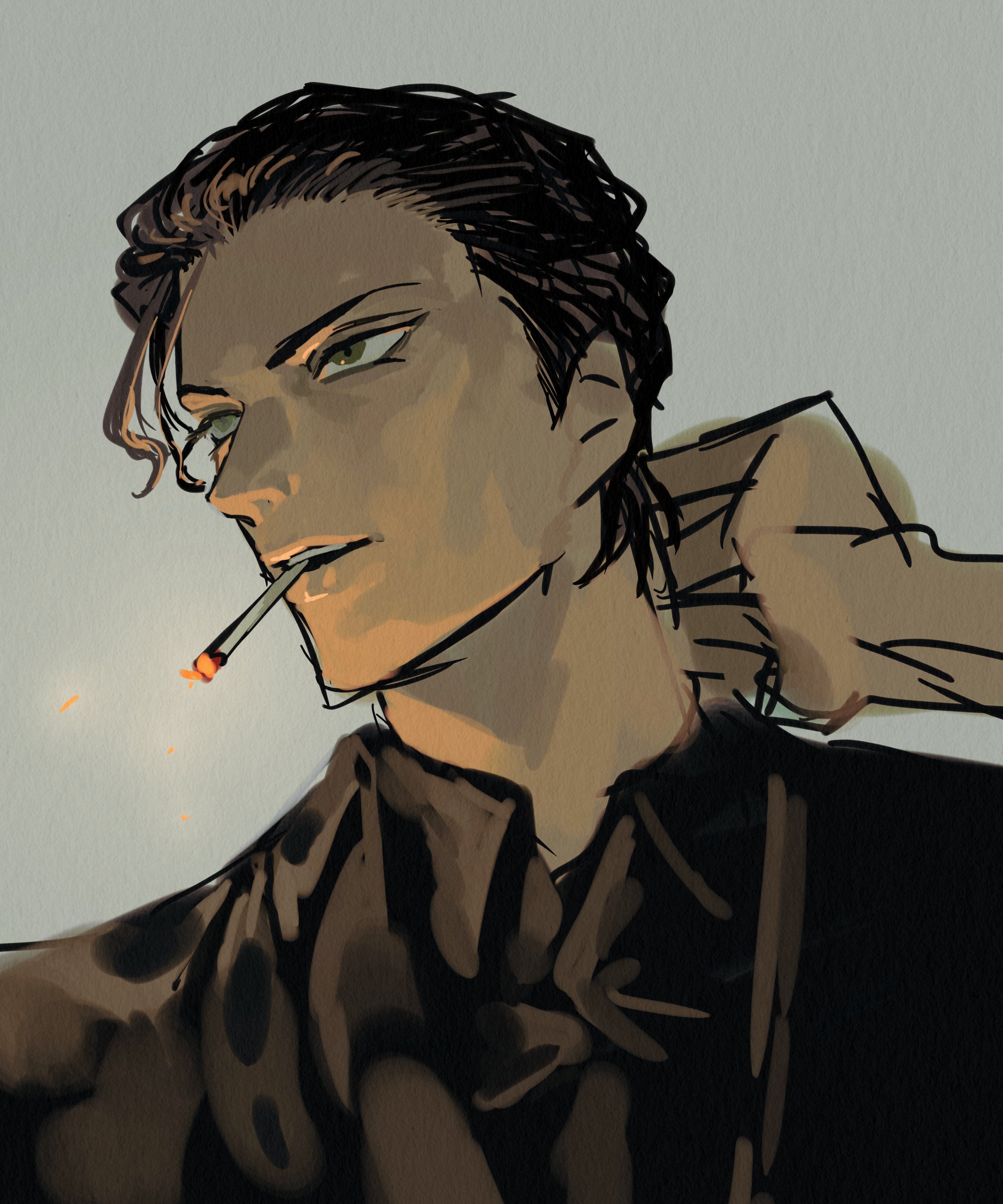 1boybaseball messyblack hairblack shirtcigarettecollared shirthair slicked backlooking to the sidemale focusshirtsimple backgroundsoloupper body