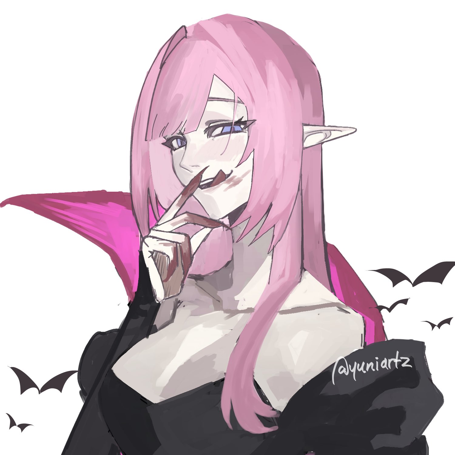 1girlbat (animal)black capeblack dressbloodblood on cheekblood on handsblue eyesbreastscapecleavagedresslarge breastslicking lipslong hairlooking at viewerpink hairpointy earssimple backgroundsolotonguetongue outvampirevery long hairwhite backgroundyundrawingz
