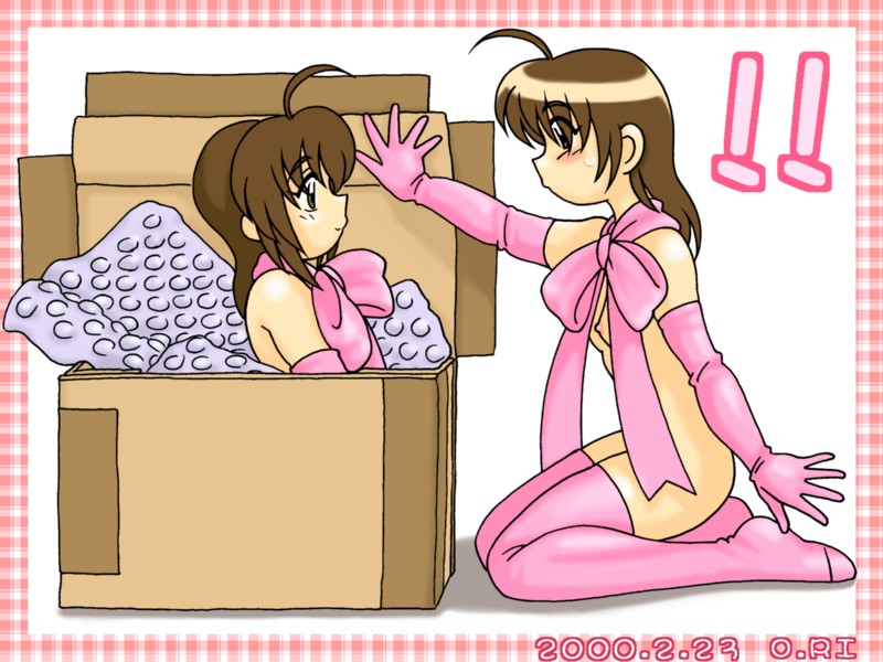 2girlsbowboxbrown eyesbrown hairbubble wrapelbow glovesglovesmultiple girlsribbonsweatdropthighhighs
