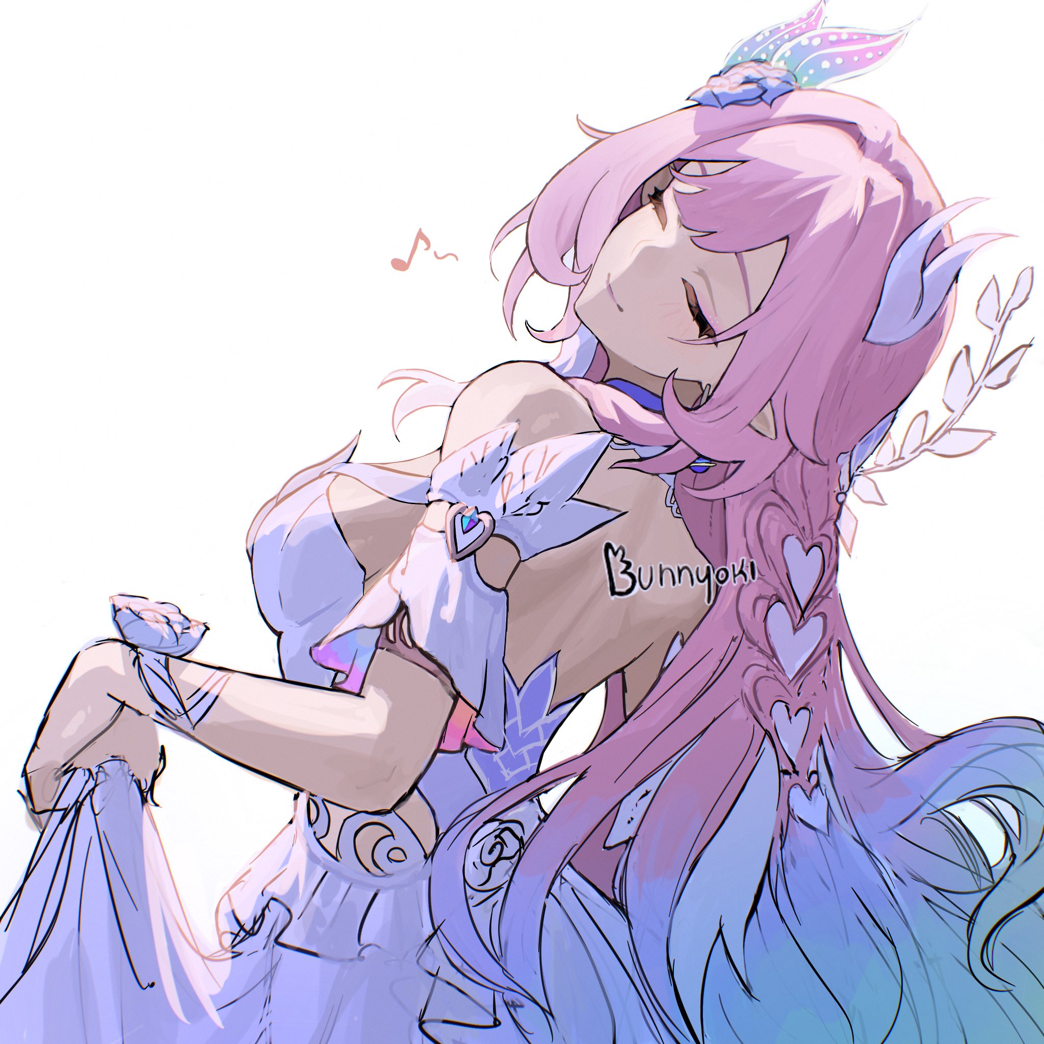 1girlartist namebare shouldersbirdbreastsclosed eyesdoveflowergradient hairgreen hairhair flowerhair ornamenthalolarge breastslong hairmulticolored hairmusical notepink hairpointy earssimple backgroundsmilesolovery long hairwhite backgroundwhite hair
