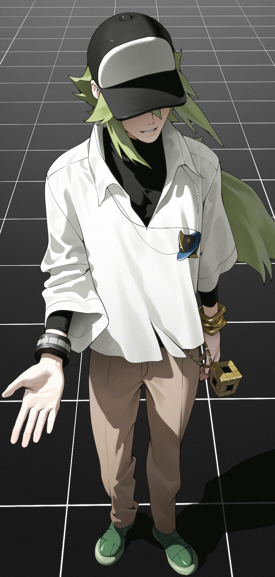 1boybanglebaseball capbraceletbrown pantsfull bodygreen hairhatjewelrylong hairmale focusopen mouthpantsshirtshoessmilesoloundershirtvoid cubewhite shirt