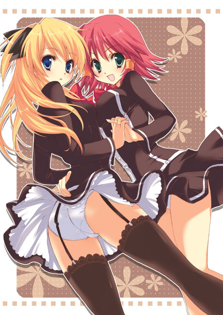 2girlsblonde hairblue eyesblushbowbreast pressbreastsclothes liftgarter beltgreen eyeshair bowholding handshuginterlocked fingerslong hairlooking backmultiple girlspantiespantyshotpink hairschool uniformshort hairskirtskirt liftsymmetrical dockingthighhighsunderwearwhite panties