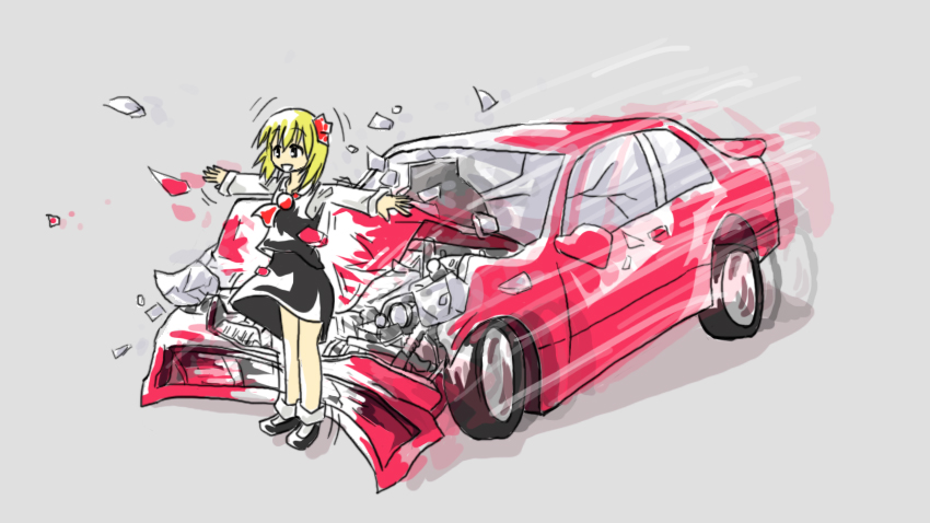 1girlblonde haircarcrashfemale focusmotor vehicleoutstretched armsred eyesribbonskirtsmilesolospread armsvehicle focus