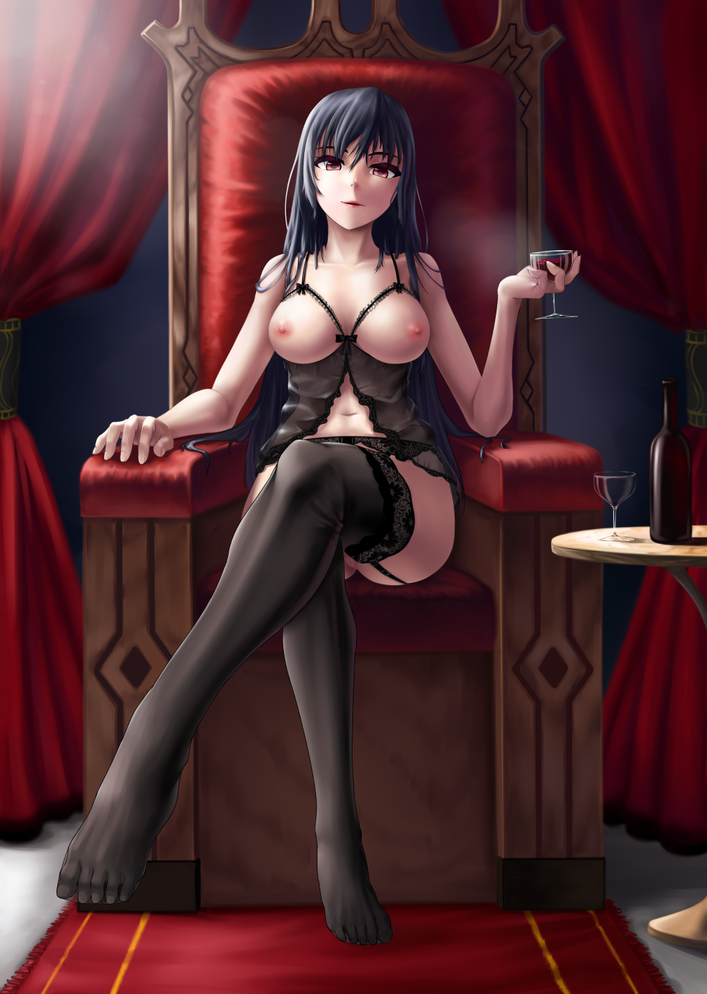 areolaebabydollblack hairbottomlessbreastless clothesbreastscupfeetfemaleFlag for Deletionfull bodygarter beltlegs crossedlingerielong hairlooking at viewernavelnipplespussyred eyessittingsmilesolotablethighhighsthroneunderwearunderwear onlywine bottlewine glass