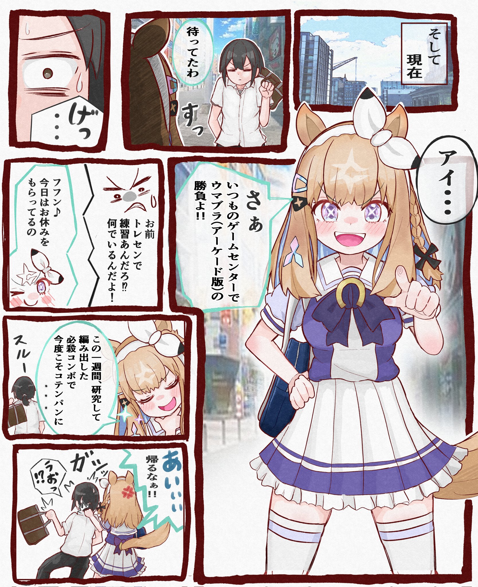 1boy1girlanimal earsannoyedblue eyesblue hairbow hairbandbrown hairhair ribbonhairbandhorse earshorse girlhorse tailpointingribbonrunningsparkling eyesstar (symbol)symbol-shaped pupilstailwhite ribbon