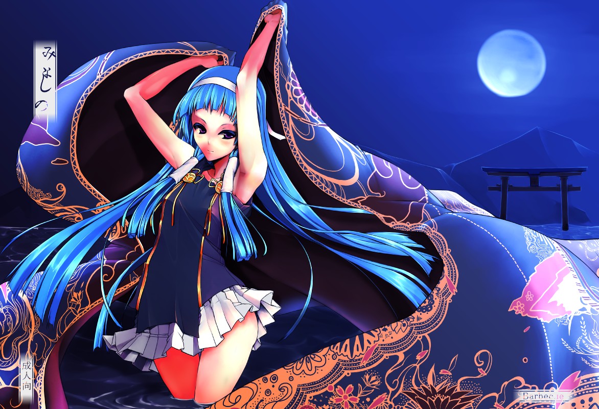 00sarms upblue hairblunt bangshair tubeshairbandlong hairmoonpleated skirtpurple eyesskirtsolowhite skirt