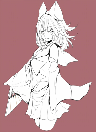 1girlbare shoulderscowboy shotcropped legsdetached sleevesfemale focushairbandhand fanlong sleeveslooking at viewermonochromepleated skirtred backgroundsimple backgroundskirtsolostanding