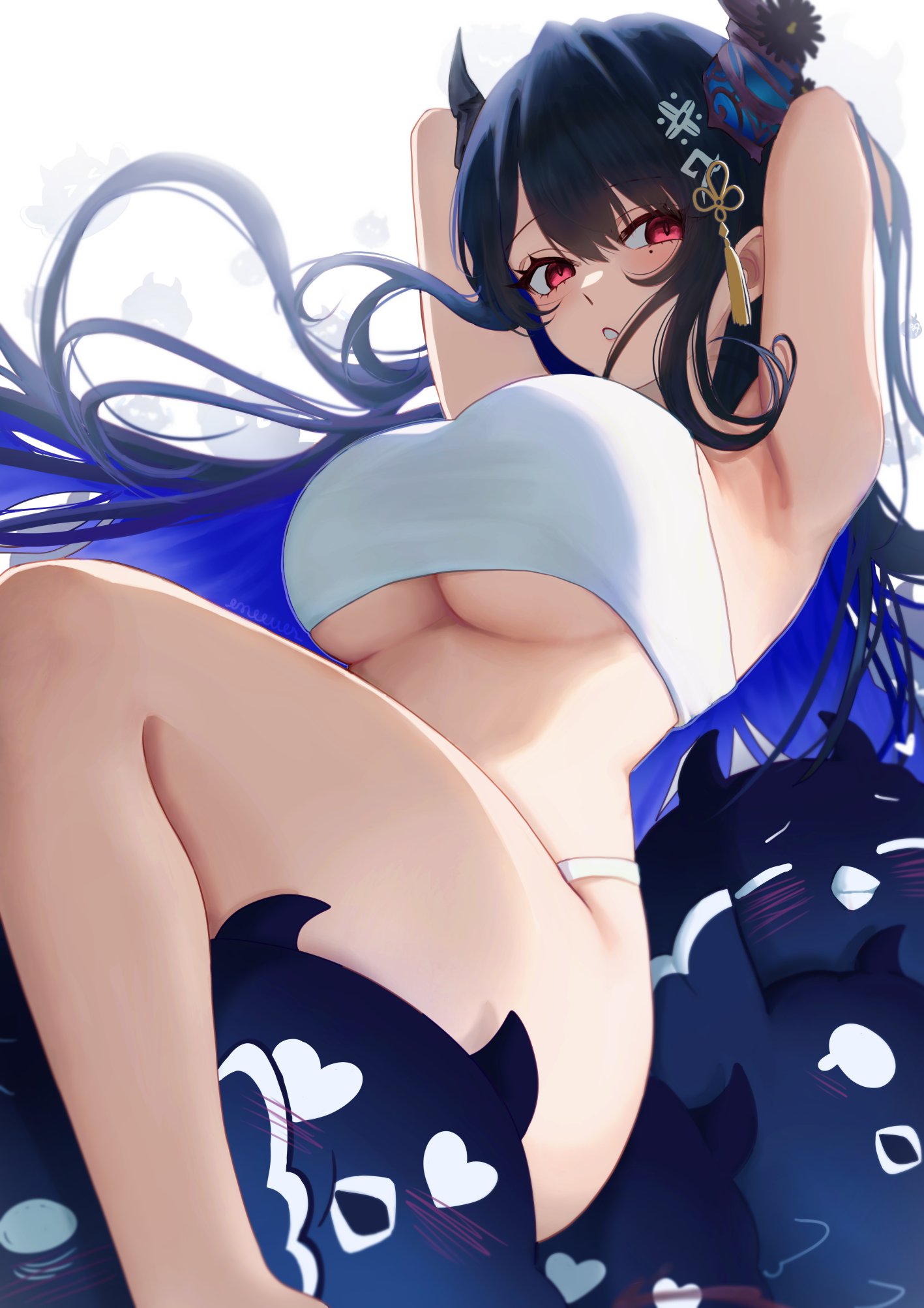 1girlarms behind headasymmetrical hornsblack hairblack hornsblue hairbreastscropped shirthornslarge breastslong hairmolemole under eyemulticolored hairpantiespurple eyessolotwo-tone hairunderboobunderwearuneven hornsvirtual youtuberwhite panties