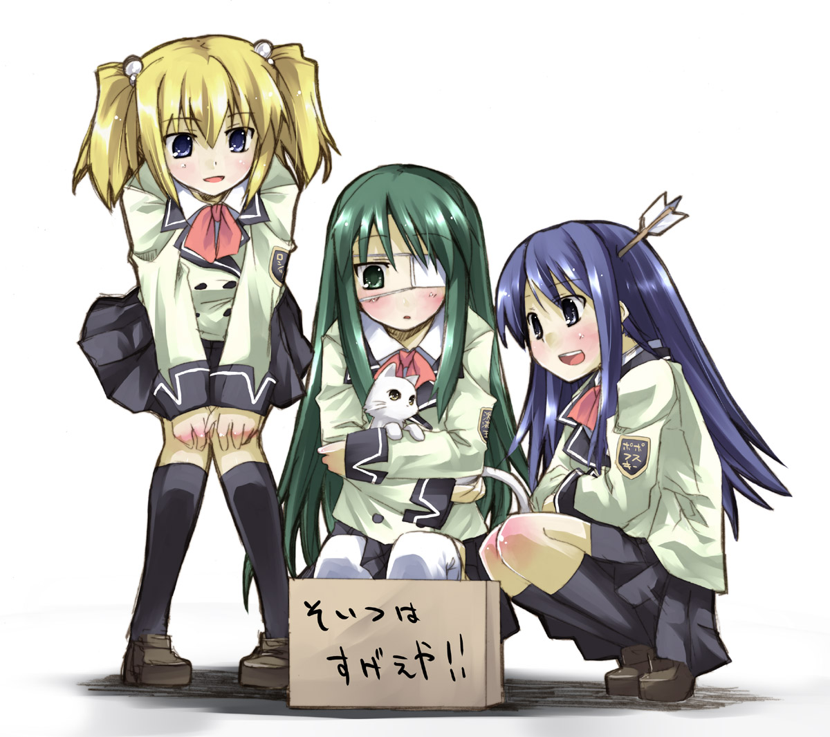 3girlsarrow (projectile)arrow in bodyarrow in headblazerblonde hairblue eyesblue hairblushboxcateyepatchgreen eyesgreen hairhair bobbleshair ornamentjacketkneehighslong hairmultiple girlsobject through headschool uniformserafukushort twintailsskirtsockssquattingthighhighstwintailsvery long hairwhite thighhighs