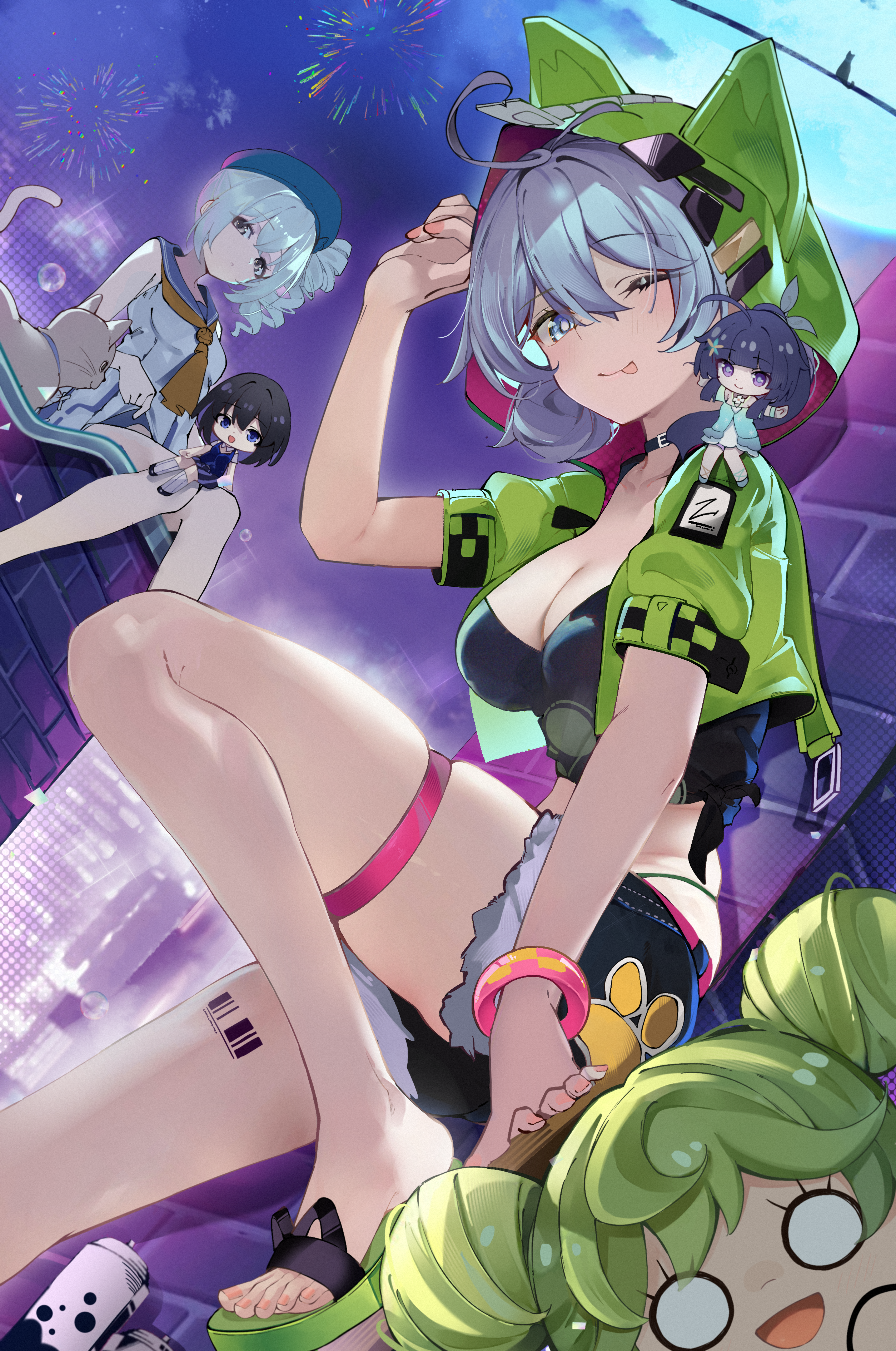 dang geun23283, iuno (wuthering waves), wuthering waves, absurdres, commentary request, highres, korean commentary, 1girl, ahoge, alternate breast size (larger), alternate costume, armlet, bag, bare shoulders, black bag, black pantyhose, blue dress, blue eyes, blue hair, breasts, cleavage, clutch purse, collarbone, criss-cross halter, dress, full body, gold shoes, gradient hair, hair between eyes, halterneck, hand on own head, handbag, high heels, holding, holding bag, jewelry, large breasts, laurel crown, light blush, long dress, long hair, long legs, looking at viewer, multicolored hair, pantyhose, parted lips, shoes, smile, solo, streaked hair, tacet mark (wuthering waves), twintails, very long hair