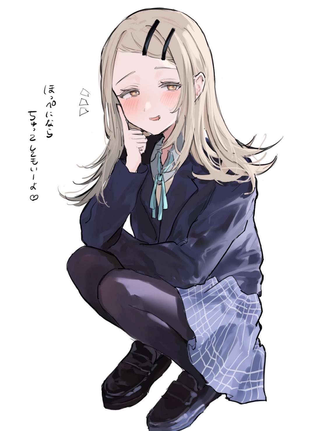 1girlaqua ribbonblack pantyhoseblack shoesblazerblonde hairblue jacketblushfinger to cheekflipped hairfull bodyhair ornamenthaircliphalf-closed eyeshand uphatsuboshi gakuen school uniformindex finger raisedjacketlapelsloaferslong hairlooking to the sideneck ribbonopen mouthorange eyespantyhoseparallel hairclipsparted bangsplaid clothesplaid skirtribbonschool uniformshirtshoessimple backgroundskirtsmilesolosquattingvestwhite backgroundwhite shirtyellow vest