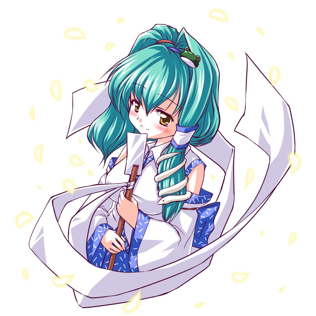 1girlblushdetached sleevesfemale focusgreen hairjapanese clothesmikosolowhite backgroundyellow eyes