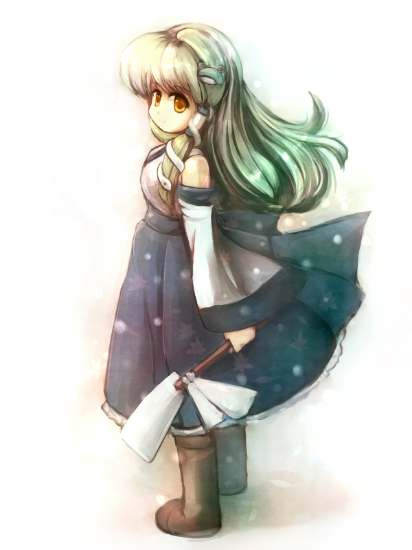 1girlbootsdetached sleevesfemale focusfull bodygradient backgroundgreen hairjapanese clothesmikosolostandingwhite backgroundyellow eyes