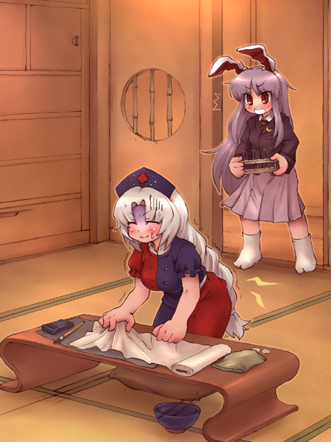 2girlsanimal earsfemale focusindoorskneelinglong hairmultiple girlspurple hairrabbit earsred eyesstanding