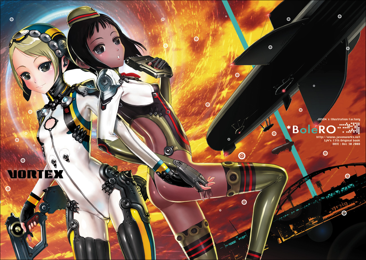 2girlsassblack hairblushbodysuitdark skindark-skinned femaleflat chestgunholding handsmultiple girlsshort hairsmilethighhighsweapon