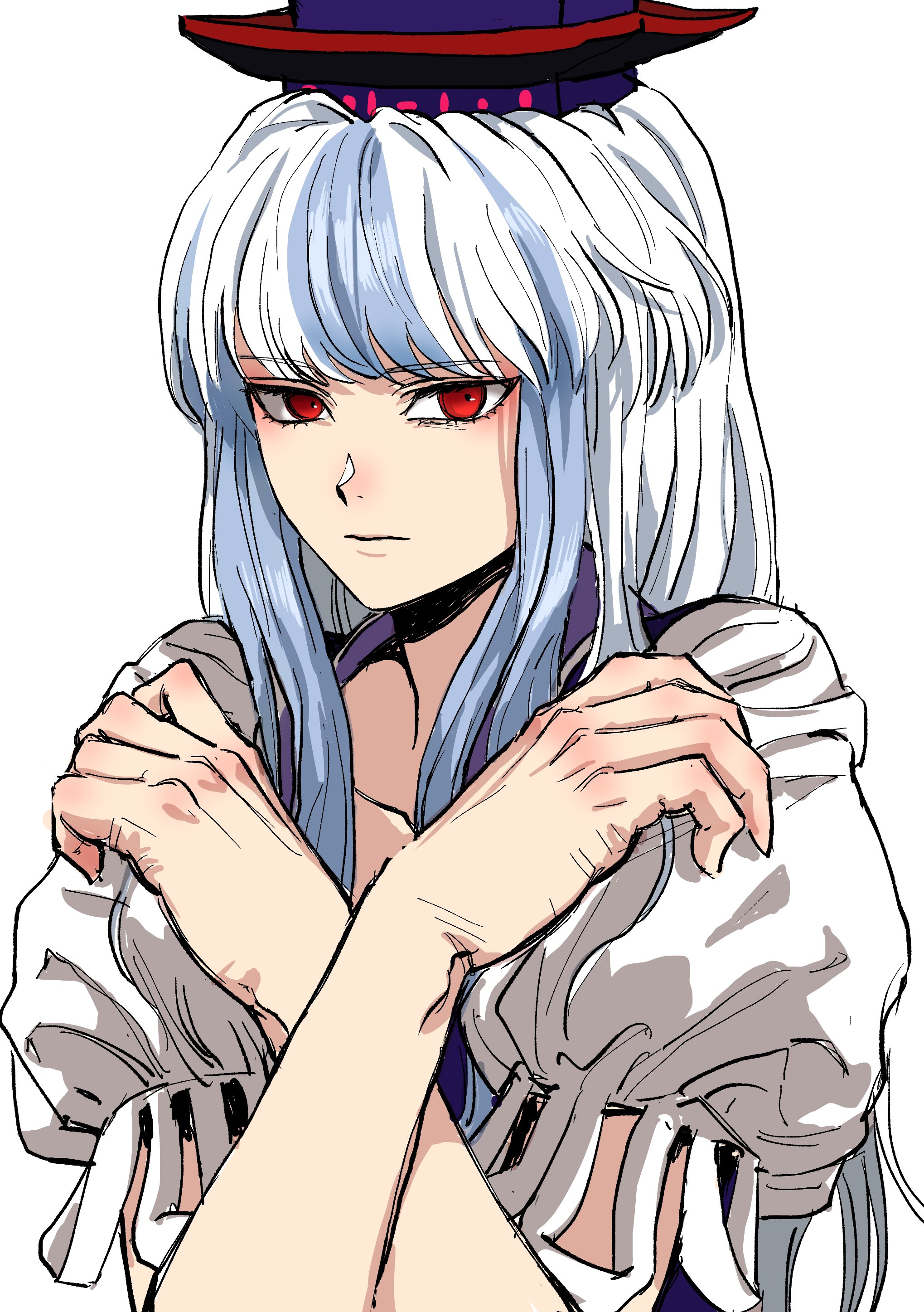 1girlblue dressblue hairblue hatdresshatlong hairmulticolored hairpuffy sleevesred eyesshort sleeveswhite backgroundwhite hair