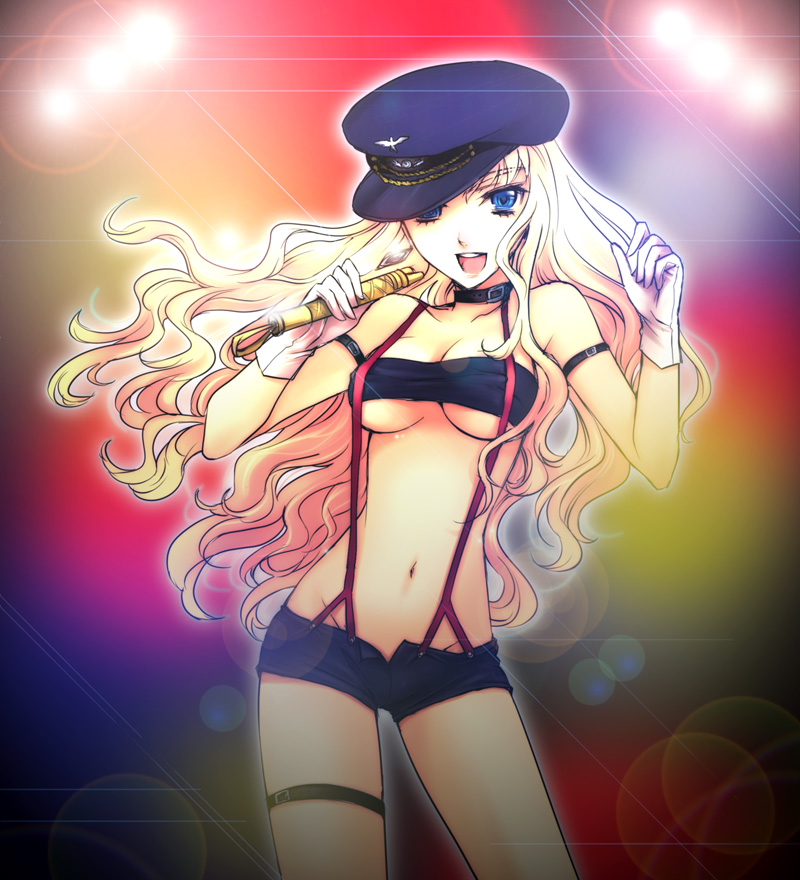 genom, onija tarou, bikini, black thighhighs, blue bikini, blue eyes, breasts, brown hair, cleavage, hat, large breasts, long hair, lowleg, lowleg bikini, oekaki, police, salute, simple background, solo, string bikini, swimsuit, thighhighs, underboob, very long hair, watermark, web address, white background