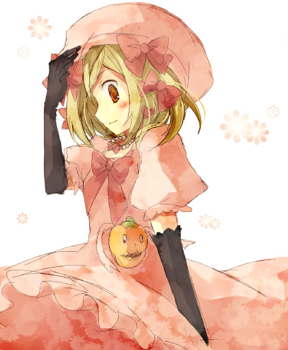00s1girlberetblonde hairdresselbow glovesfemale focusflowergloveshatjack-o'-lanternorange eyespink dresspink hatpumpkinribbonshort hairsolo