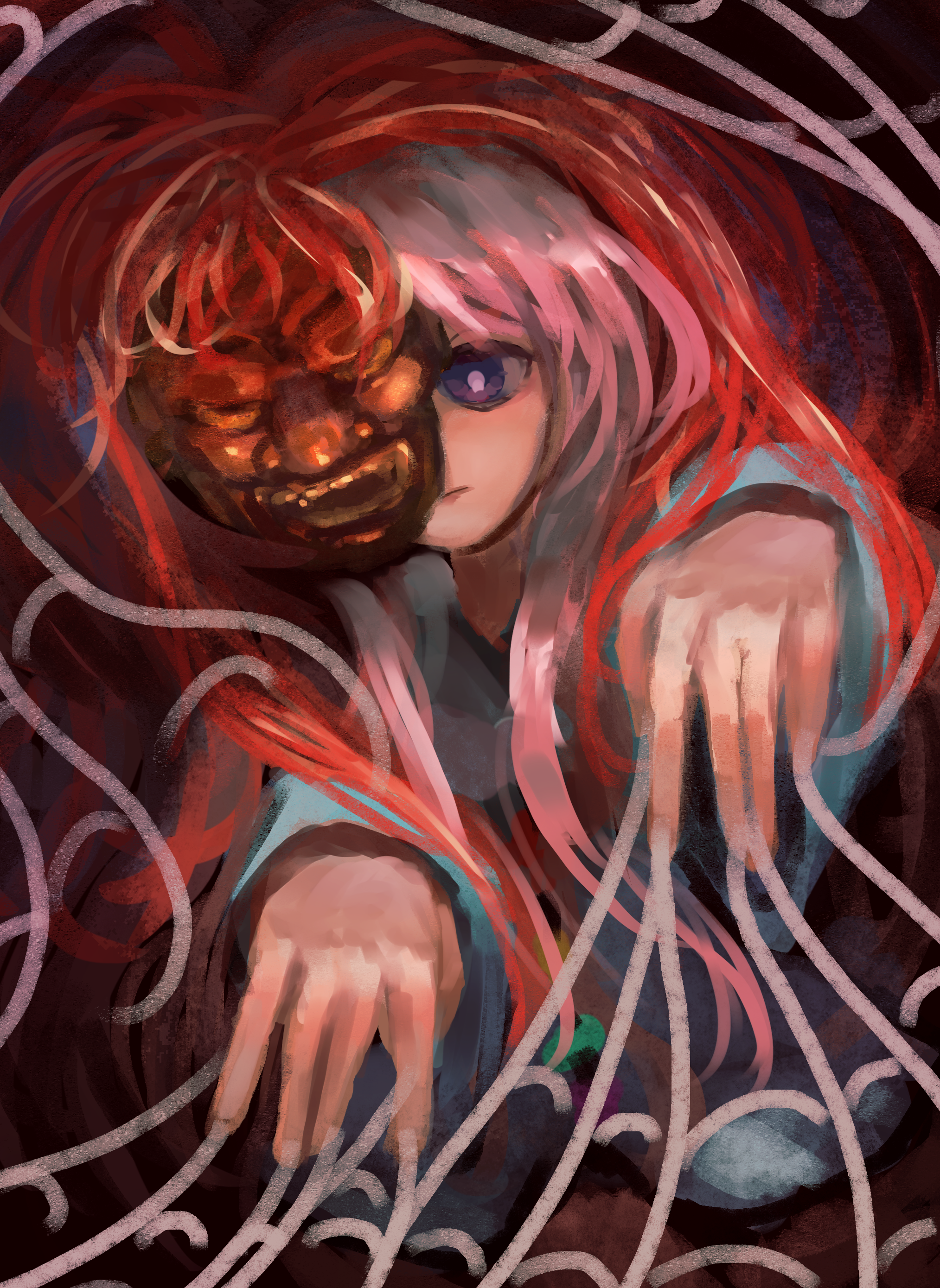 1girlblue shirtclosed mouthexpressionlesslong hairlong sleeveslooking at viewermaskmask on headnoh maskokina maskpink hairpurple eyesshirtsoloupper body