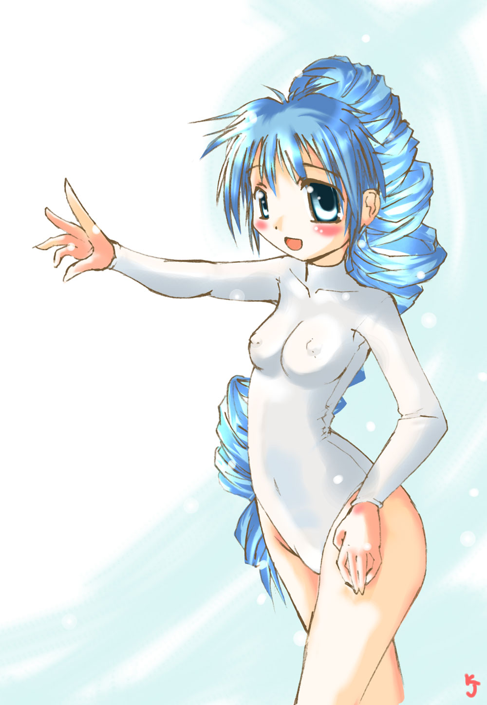 1girlblue eyesblue hairbreastscovered erect nipplesdrill hairfemale focusleotardlong hairmatching hair/eyesponytailsmall breastssolo